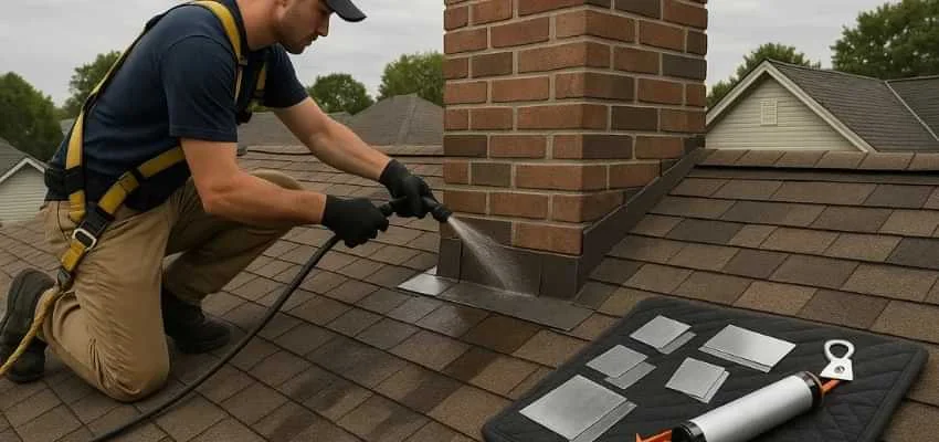 We examine crown slope, cap fit, mortar joints, brick or stone surfaces, and flashing transitions at the roofline. In Pleasant View, North York this area is often the origin of leaks.